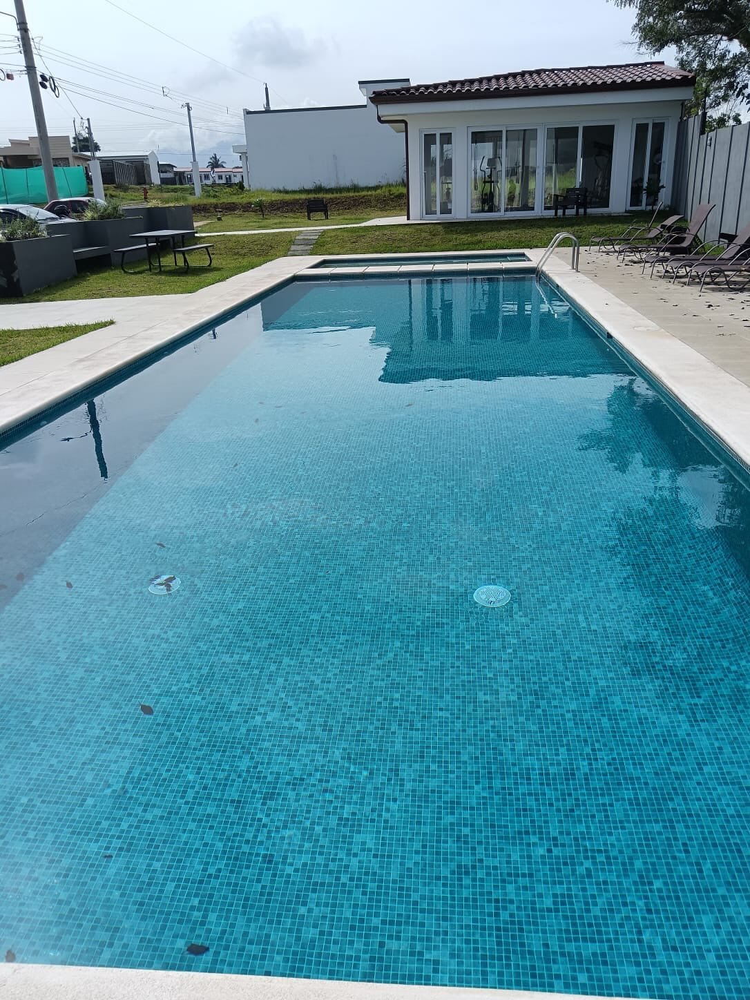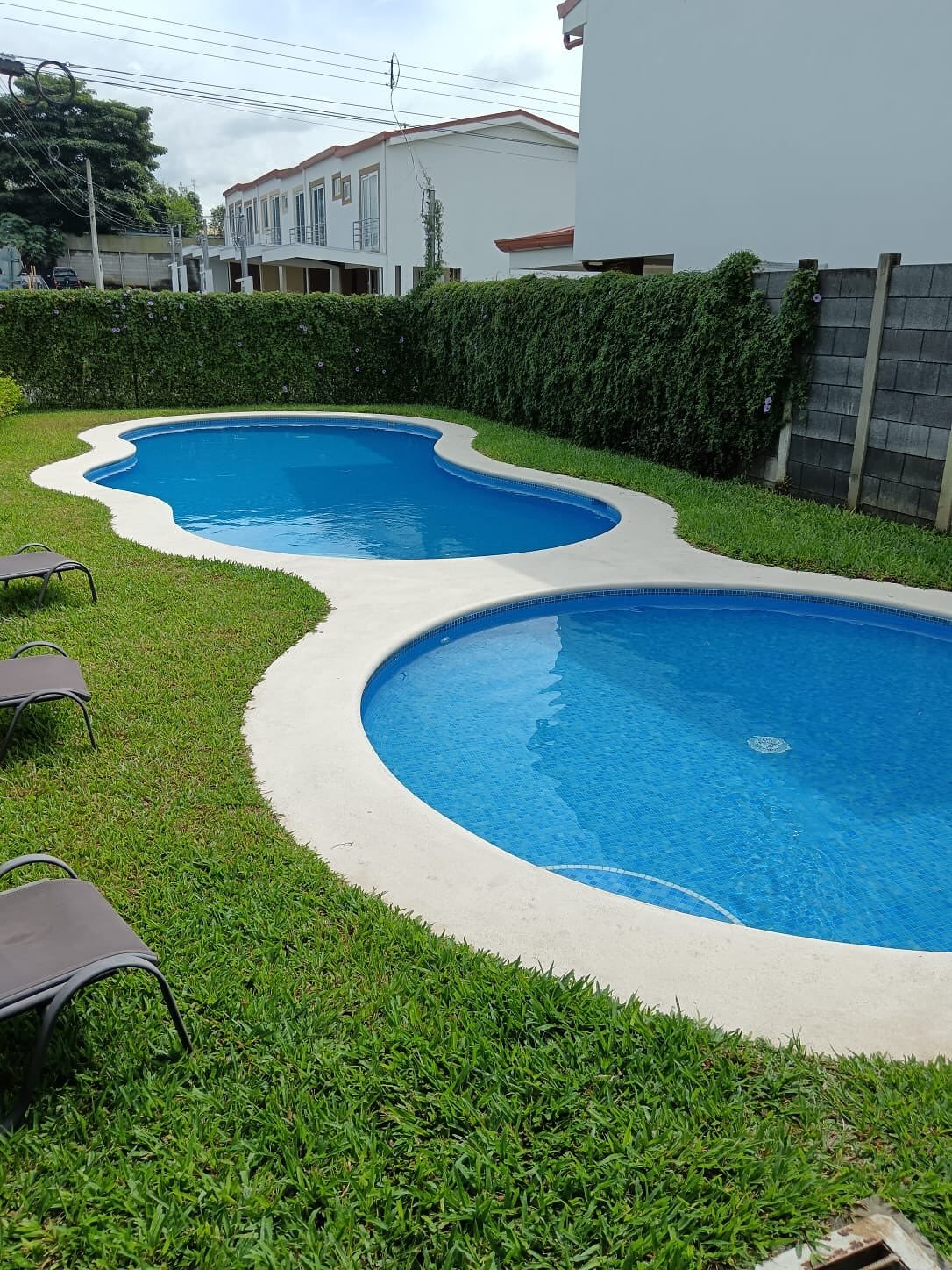 2 Piscina al aire libre con sillas de bronceado.
